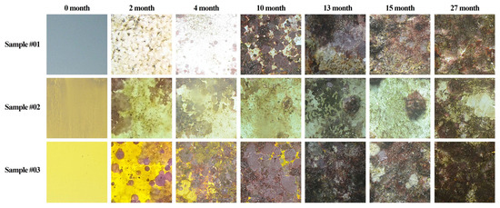 The progression of biofouling coverage on the coating samples was monitored throughout the 27-month exposure period (Figure 5). Time-lapse images of the installed panels illustrated gradual accumulation of fouling organisms and clear contrasts among coating types. The non-antifouling coating (sample #03) exhibited dense colonization from the early stages, whereas both SPC coatings (sample #01 and #02) suppressed initial settlement.