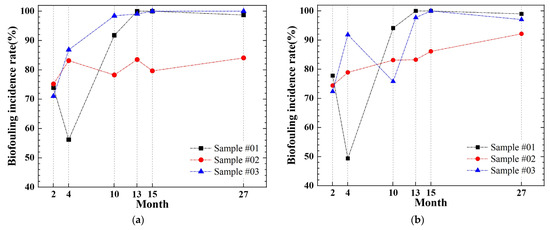 Based on these observations, the biofouling coverage was quantitatively analyzed to evaluate temporal changes under each coating condition (Figure 8). For the non-antifouling coating (sample #03), coverage exceeded 89% by 4 months and approached near-complete fouling by 10 months, with replicate values diverging (98% and 76%) but averaging 87%. SPC-A (sample #01) rapidly lost function after coating abrasion, while SPC-B (sample #02) maintained low fouling levels up to the 10-month observation before gradually declining in performance, reaching 88% coverage by 27-month. Although only two replicates were available per condition, their highly consistent patterns confirmed the reliability of the observed fouling progression.