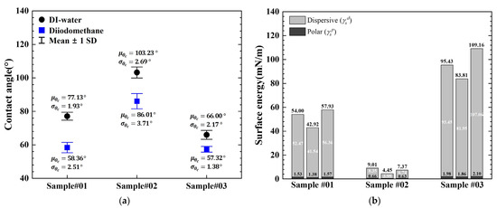 where denotes the liquid surface tension, the measured contact angle, and and the dispersive and polar components of the liquid surface tension, respectively. From these calculations, the surface energy of each coating type was obtained and quantitatively compared to evaluate differences in wettability among the coating systems.