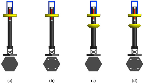 Figure 19. For the surge, heave, and pitch degrees of freedom, all four main buoys exhibit wave excitation forces that generally increase initially then decrease with rising wave frequency. The surge excitation force peaks between 1.4 and 1.9 rad/s. The heave excitation force shows relatively high values at low frequencies, with a primary peak occurring at 0.9–1.2 rad/s and a secondary peak near 4.8 rad/s. For pitch excitation, the main peak appears at 2.2–2.4 rad/s and a secondary peak at 0.4–0.5 rad/s. The main buoys with the disc-shaped buoy yield greater wave excitation forces in surge and heave. Their corresponding peak frequencies for heave and pitch are higher than those without the buoy. The solid damping plate exhibits higher wave excitation forces than the perforated plate in the surge, heave, and pitch motions. The dish-shaped buoy and perforated damping plate enhance stability in pitch, with the former exhibiting high power absorption potential.