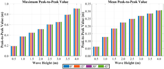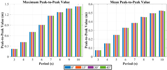 Figure 28 present the simulated relative displacement results for the four WECs in the 0° direction under various wave cases. Due to differences in the motion response among the WECs, their motion amplitudes vary under the same wave case. Therefore, this section accounts for the effect of the motion response in the relative displacement analysis.