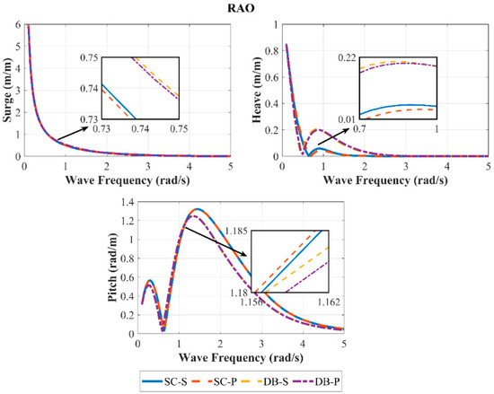 Prior to domain response analysis of the WECs, frequency domain analysis based on potential flow theory is essential. Given the structural symmetry, the surge, heave, and pitch degrees of freedom at 0° wave incidence were analyzed. The frequency range spanned 0.1–5 rad/s.