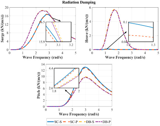 Figure 18. The radiation damping for the surge, heave, and pitch motions of all four main buoys exhibits consistent trends: initially increasing then decreasing with rising wave frequency. The peak radiation damping for surge occurs between 2.4 and 2.9 rad/s, while for heave, it ranges from 1.1 to 1.7 rad/s. The peak radiation damping for pitch occurs near 3 rad/s. In the surge and heave directions, the disc-shaped buoy enhances radiation damping. For pitch motion, however, the disc-shaped buoy reduces radiation damping and shifts the peak frequency: decreasing for surge but increasing for heave. The solid damping plate provides higher radiation damping than the perforated counterpart in the surge, heave, and pitch motions. The solid damping plate exhibits higher radiation damping in the surge, heave, and pitch directions than the perforated counterpart. The dish-shaped buoy and perforated damping plate significantly suppress the peak motion responses of the main buoy, enhancing device stability.