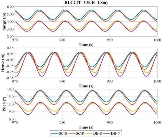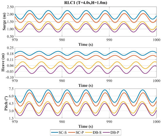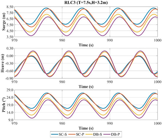 For the surge response, the peak values across the three wave cases consistently follow DB-P < DB-S < SC-P < SC-S. DB-P and DB-S exhibit similar peak values, both significantly lower than SC-P and SC-S. Respectively, DB-P and SC-P show lower peaks than DB-S and SC-S. Under the RLC1 and RLC2 wave cases, SC-P yields the maximum response amplitude, whereas DB-S gives the minimum. Under RLC3, DB-P produces the maximum amplitude and SC-S the minimum. The solid damping plate shows smaller amplitude but larger peak values than the perforated types across all wave cases. The disc-shaped buoy exhibits lower amplitude under RLC1 and RLC2 but higher under RLC3. Their peak values remain lower than the simplified configurations in all wave cases.