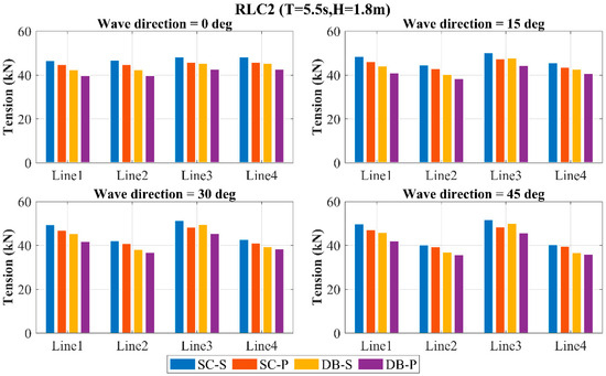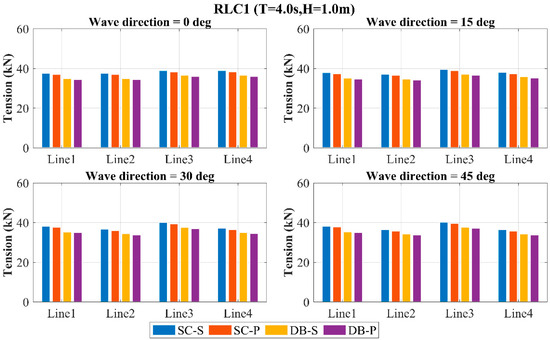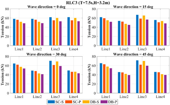 Figure 25 present the maximum tensions in mooring lines 1–4 for all the WECs under three wave cases at directions of 0°, 15°, 30°, and 45°. The results demonstrate that with increasing sea state severity, the mooring line tensions rise consistently across all directions for each WEC, while the tension differences between WECs significantly diverge.