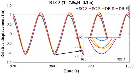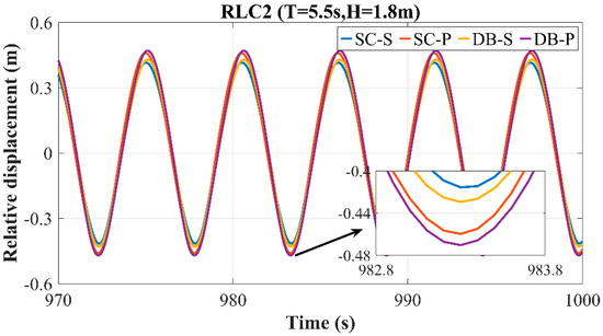 As shown in the figure, the peak-to-peak values of the relative displacement increase with increasing wave severity for all four WECs. Under the RLC1 wave case, the SC-P exhibits the largest peak-to-peak value, followed by SC-S, while the DB-S has the smallest value. Under the RLC2 and RLC3 wave cases, DB-P exhibits the largest peak-to-peak value, while SC-S has the smallest. As the wave severity increases, the difference in the peak-to-peak value between SC-P and DB-S gradually decreases. WECs with a perforated damping plate consistently exhibit large relative displacement peak-to-peak values under all three wave cases. Under the RLC1 wave case, WECs with the dish-shaped buoy yield smaller relative displacement peak-to-peak values than those without it. Under the RLC2 and RLC3 wave cases, the presence of the dish-shaped buoy yields larger relative displacement peak-to-peak values than its absence.