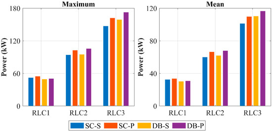 Figure 29 present the power absorption results for the four WECs under the three regular wave cases. The results indicate that both the average and peak power differ among the WECs across wave cases, and the disparity in power increases with the wave severity. Both the average and peak power exhibit similar trends across the WECs. Under the RLC1 wave case, SC-P achieves the highest power, whereas DB-S yields the lowest. Under the RLC2 and RLC3 wave cases, DB-P and SC-S achieve the highest and lowest power, respectively. WECs with a perforated damping plate consistently yield relatively high mean and peak power under all three wave cases. Under the RLC1 wave case, WECs featuring the dish-shaped buoy achieve lower mean and peak power than those without it. Conversely, under the RLC2 and RLC3 wave cases, the presence of the dish-shaped buoy results in higher mean and peak power compared to its absence.