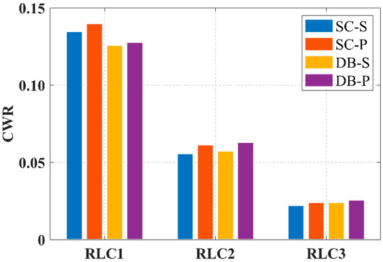 Figure 30 presents the CWR values for the four WECs across wave cases, where the WECs exhibit distinct effects on the CWR. All WECs attain maximum CWR under the RLC1 wave case, with the values declining as the wave severity increases. SC-P yields the maximum CWR under RLC1, whereas DB-P achieves higher CWR under RLC2 and RLC3. WECs with perforated damping plates consistently yield higher CWR, while the dish-shaped buoy enhances the CWR under RLC2 and RLC3 but reduces it under RLC1.