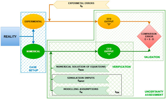 During the tests, the data are handled using international standard methodologies for uncertainty evaluation, while carefully accounting for experimental errors in the obtained results; indeed, “all the relevant parameters are affected by uncertainty and its assessment is necessary to provide the required confidence intervals of all relevant variables used for validation” [12]. While, following the development of CFD predictions, in the last decades several types of approaches can be listed in the field of Verification, Validation and Uncertainty Assessment (VVUA) [13].