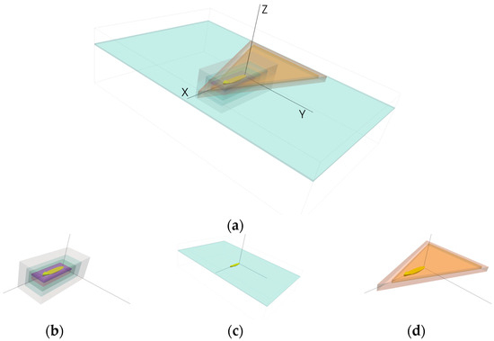 To balance the computational effort and the need for a sufficiently physical description of the problem, three kinds of parametric refinements were created inside the domain. Figure 2a shows alle the refinements, while their details are reported as follow: five concentrical boxes with a hierarchical increasing isotropic refinement (cell size length factor 2) approaching the model hull are created, as seen in (Figure 2b); an additional anisotropic parallelepiped refinement across the entire free-surface is visible in (Figure 2c) and lastly, in order to better describe the wave pattern, a couple of prisms with an isosceles triangle base (Figure 2d) have been introduced.
