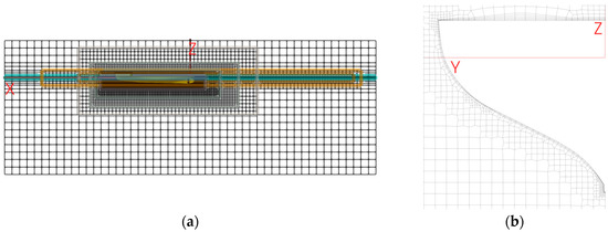 Detail about symmetry plane mash (a) and transversal section for (b).