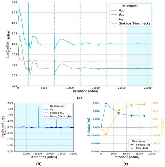 Once the calculation reaches the convergence criteria, it is possible to perform the so-called post-processing analysis. For this particular kind of study (where several simulations performed with the same numerical set-up have been performed at model scale to be compared with an equal number of experimental tests), the history of the signal of the total resistance, , the frictional resistance, , and the pressure one, , deserves particular attention. For each simulation and with the respect to define a representative value for each one of them, the following four step work-flow has been created: step 1, graphical analysis to assess if a stabilized ratio has been achieved; step 2, low-pass filtration for the representative final part of the signal (last 5000 iterations) to neglect the numerical noise, where present; step 3, comparison among the standard deviation calculated for the two signals obtained to check for the agreement among them; step 4, evaluation for the representative value of the filtered signal. An example of the results from a CFD calculations are reported on Figure 4: on top-side the signals of forces (, and ) with the trace of the equilibrium check (the light blue triangles) and the stabilized zone for signals are shown for a single model hull (Figure 4a) along with the stabilized , its filtered signal () and representative value on bottom-left (Figure 4b); while the equilibrium checks for trim and sinkage are shown in bottom right (Figure 4c). For each model, CFD simulations have been performed at different speeds to reproduce the EFD experience.