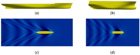 Bozzo et al. [32] proposed to assess the virtual towing tank accuracy through a comparison between an EFD database and the CFD calculations. In the current work, two hulls (Hull_A and Hull_B) have been selected; their shapes and wave patterns for a single speed are shown for Hull_A in Figure 5a,b while, for Hull_B in Figure 5c,d, respectively.