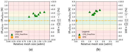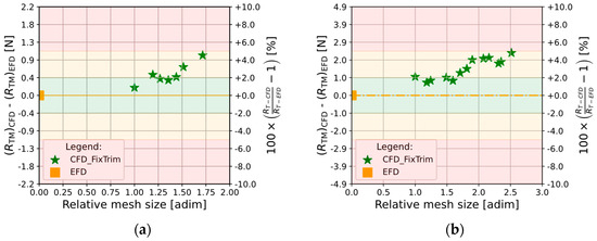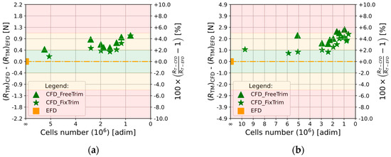 Similar results have been achieved in all the other cases reported in Table 3, and considering that has a direct dependency on the trim, a possible way to reduce the obtained noise shown by the results, consists of performing simulations with a fixed value for trim and sinkage. Hence, for the two speeds identified by the labels Hull_B-3 and Hull_B-4, other simulations (labelled as Hull_B-3* and Hull_B-4*) have been run at fixed trim and sinkage conditions, considering the attitudes output from the two finer simulations. Figure 7 shows the results for the simulations performed in this configuration, in particular Figure 7a deals with Hull_B-3* and Figure 7b with Hull_B-4*, respectively.