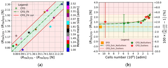 Considering the cases labelled Hull_B-3 and Hull_B-4, where eight simulations have been performed for each case, the results aren’t into an asymptotic range. In particular, considering the versus a finer mesh topology (negative growth rate of cells, defined as and supposed finer than ), results exhibit a pattern which doesn’t allow finding a curve passing thought all of them and therefore, the asymptotic range seems not to be achieved, as shown in Figure 6a for Hull_B-3 and in Figure 6b for Hull_B-4.