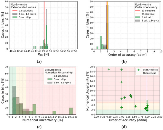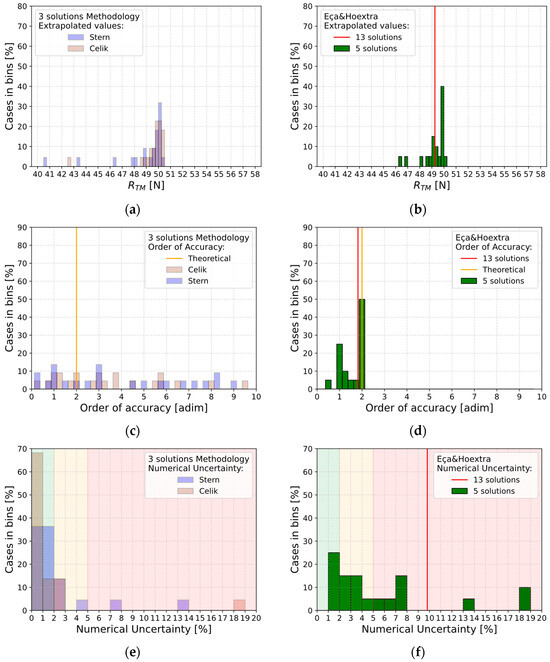 Compared to the three-solution methods, the four-solution methodology demonstrates greater robustness and reliability. It consistently provides results for extrapolated values, order of accuracy, and numerical uncertainty. Out of 40 cases analyzed using the three-solution methods, only 22 yielded usable results (a success rate of 55%), whereas all 20 cases evaluated with the four-solution approach were successful (100% success rate). Based on these findings and the data used in the present study, Eça and Hoekstra’s approach is preferable due to its robustness. To partially mitigate the overestimations observed, the order of accuracy obtained by the mesh independence analysis can be used an index for the reliability of the numerical uncertainty estimation and when its value decrease below 1.5 further investigations needs to be carried out.