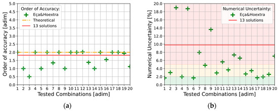 To partially mitigate the noise in results, the order of accuracy obtained from mesh refinement analysis can serve as an indicator of reliability. If the computed order deviates significantly from the theoretical value (), particularly falling below 1.5 or higher than 2, the associated uncertainty is likely overestimated, and further investigation is recommended.