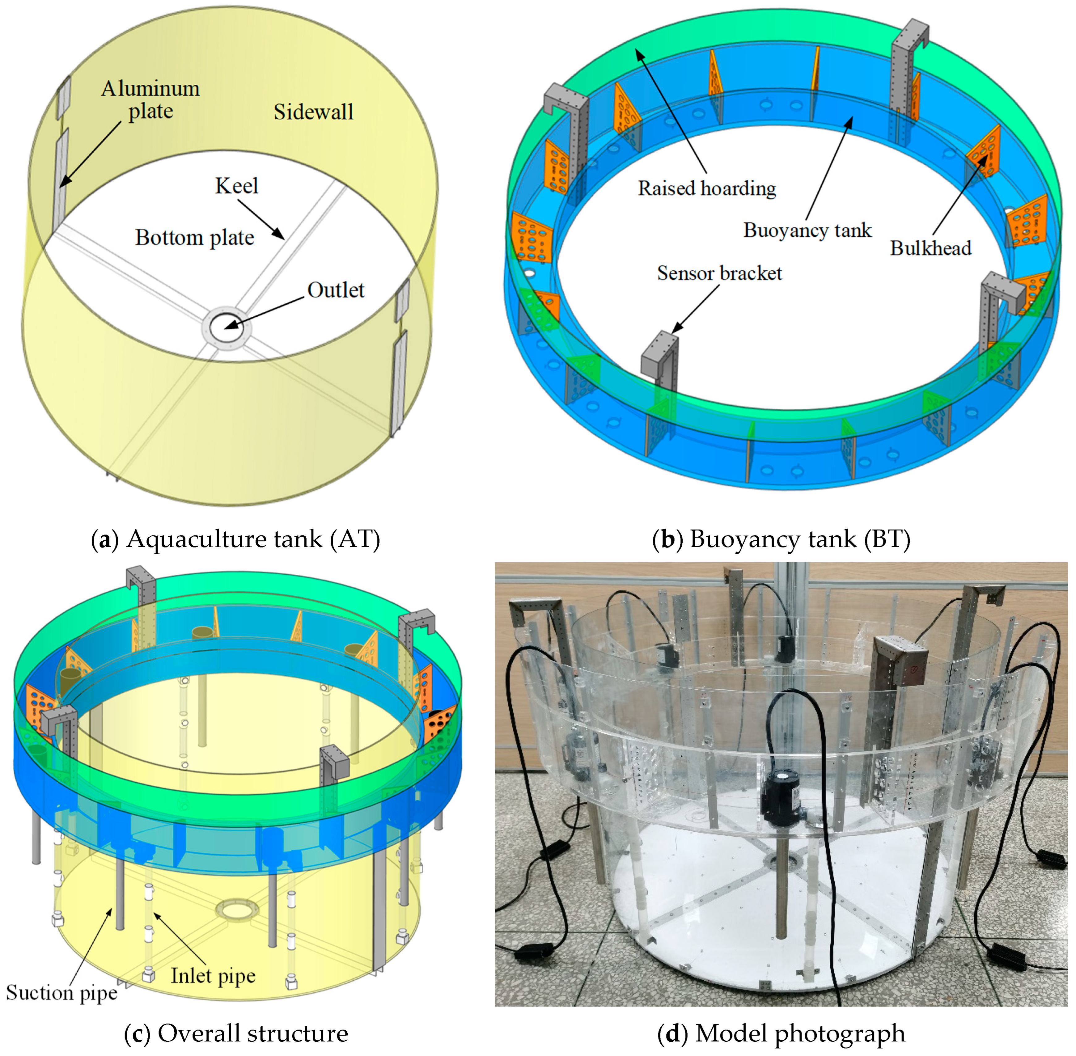 Figure 2. The sidewalls of the AT are made of 2 polycarbonate plates with a thickness of 3.6 mm, and the splices are clamped with aluminum plates. The bottom plate of the aquaculture tank is made of a 3 mm acrylic plate and installed with a cross-shaped keel to enhance its strength. In addition, to provide additional buoyancy for the bottom plate, EVA (Ethylene vinyl acetate copolymer) plates with a thickness of 1 cm were affixed to the lower part of the bottom plate. The aquaculture tank is embedded inside the buoyancy tank and is fastened by screws.