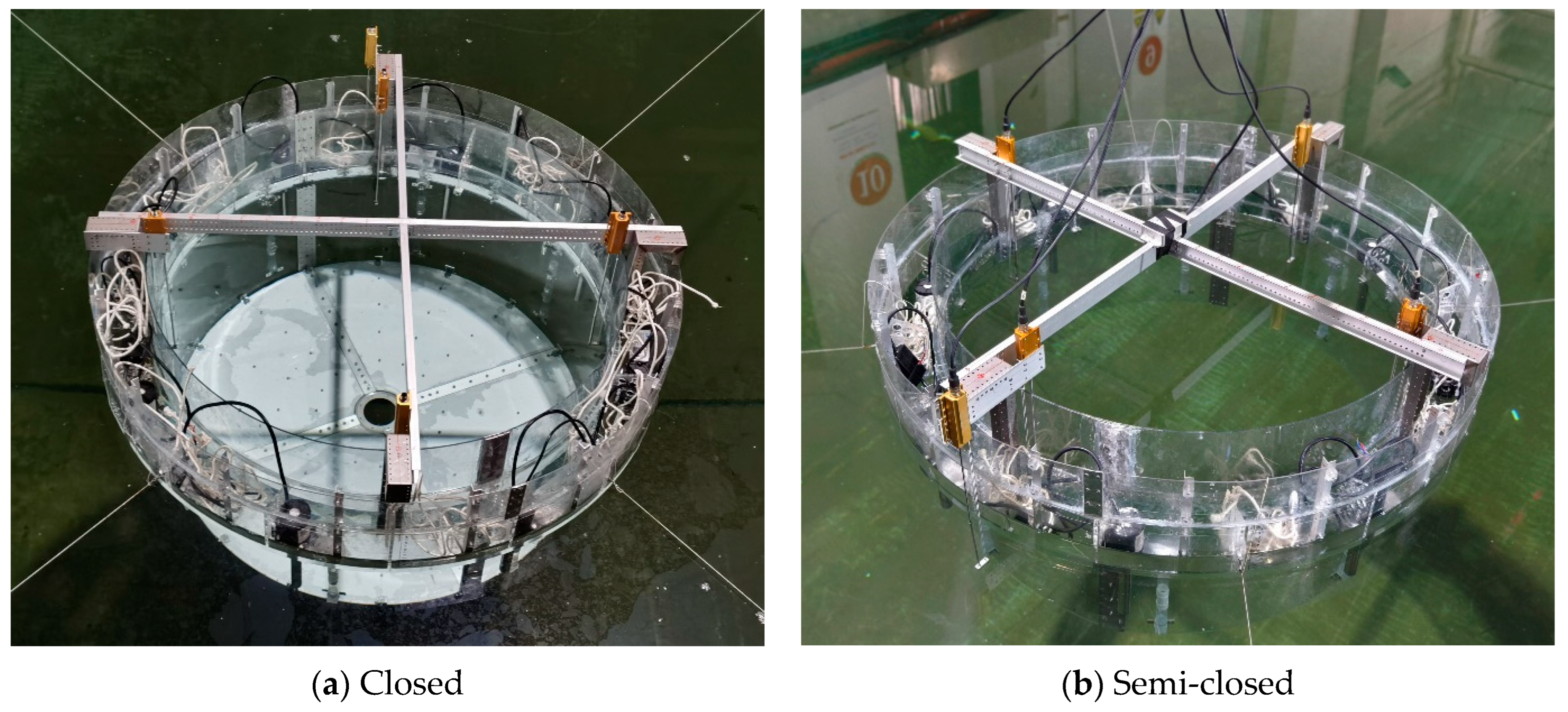 Four horizontal soft springs with stiffnesses of 25 N/m (closed) and 10 N/m (semi-closed) restrained the aquaculture platform models, accounting for their mass and added-mass discrepancies. Both aquaculture platform models are shown in
