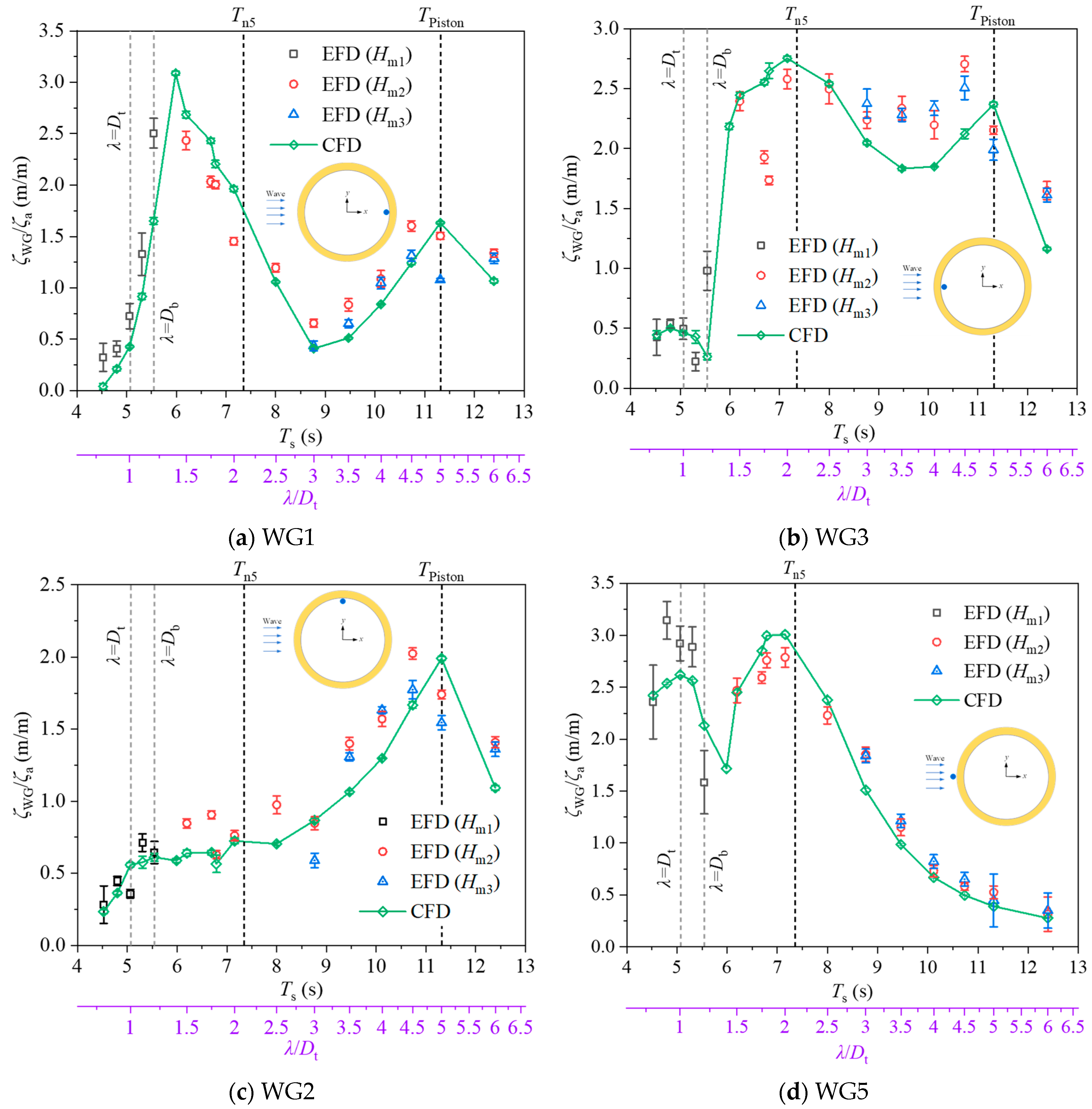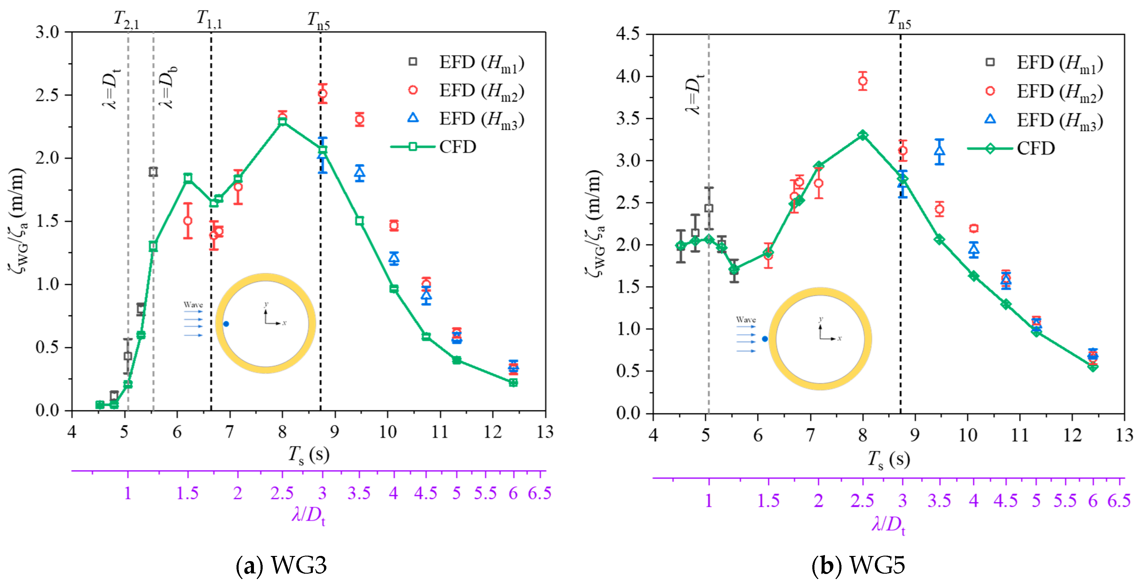 Hm3 = 0.06 m, according to the capacity of the wavemaker. The towing tank uses a hydraulically driven single wave-making panel, which has a weak high-frequency wave-making capability, so the minimum wavelength in the test was chosen to be 0.8 m. The wavelength to aquaculture tank diameter ratio (