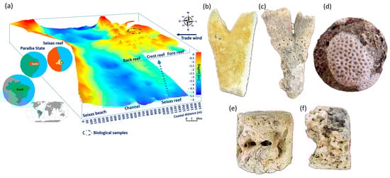 Biological samples: (a) Seixas Reef in João Pessoa [30]; (b) Millepora alcicornis; (c) Mussismilia harttii; (d) Siderastrea stellata; (e,f) core samples of reef fragments.