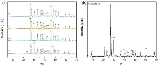 For the concrete sample (Figure 3b), the diffractogram revealed a complex polycrystalline system, with a predominance of quartz (SiO2), identified by intense peaks at 20.8°, 26.6°, and 50.1°, corresponding to 43% of the total crystalline phase. The significant presence of calcite (21.2%) and magnesian calcite (14.3%), along with the absence of characteristic portlandite peaks typically observed around 18° and 34°, indicates carbonation reactions occurring in the cementitious matrix. These reactions involve ionic substitutions that favor the stabilization of Mg2+ within the carbonate lattice.