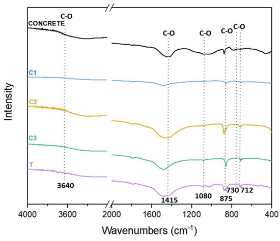 The obtained FTIR spectra (Figure 4) were analyzed to identify the functional groups present. All samples exhibited similar peaks, particularly in the regions associated with carbonate groups (C–O), with subtle variations between the spectra of the biological samples (T; C1; C2; C3) and the concrete sample.