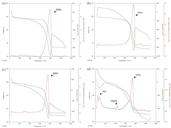 The concrete sample (Figure 5d) exhibits a distinct thermogravimetric profile. Mass losses occurred mainly in two stages: up to 150 °C (water) and between 600 and 800 °C (carbonates). The initial mass loss (~5%) between 50 °C and 150 °C is attributed to dehydration of free and adsorbed water, as well as hydrated phases such as C–S–H, as reported by Bui et al. [64]. The main mass loss (~10%) between 600 °C and 800 °C is due to the decomposition of CaCO3 into CO2 and CaO. This finding is also supported by the carbonate bands identified in the FTIR spectra (875 and 1415 cm−1). The intense endothermic peak in the DSC curve within this range confirms the thermal transition, and the lower mass loss compared to coral samples suggests a lower relative CaCO3 content in the concrete—consistent with the phase quantification from XRD analysis. The thermal overlap with coral decomposition suggests partial compatibility in thermal behavior, despite differences in composition.