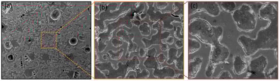 The SEM images at different magnifications (Figure 6) reveal a highly porous skeletal structure, with both intrinsic and interconnected porosity. At 100× magnification (Figure 6a), the macrostructure of the hydrozoan coral is evident, characterized by a branched architecture with large interconnected cavities and well-defined internal channels. At higher magnifications (500× and 1000×, Figure 6b,c), finely textured microstructures become visible, including interlinked channels and microporous surfaces, which are consistent with regions of calcium carbonate crystal growth and deposition [63]. This morphology is typical of marine calcifying organisms and is associated with several important biological and ecological functions [68,69,70].