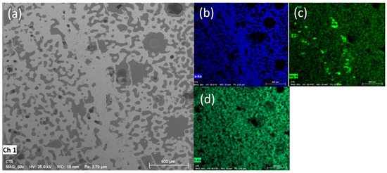 BSE micrograph: (a) at a magnification of 50×; (b) elemental mapping of calcium; (c) elemental mapping of magnesium; (d) elemental mapping of sulfur.