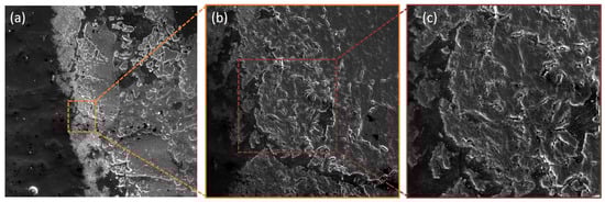 SEM micrographs of concrete: (a) 100×; (b) 500×; (c) 1000×.