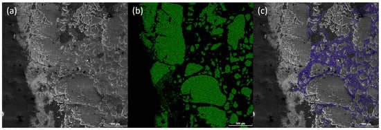 BSE micrograph of concrete: (a) at a magnification of 100×; (b) elemental mapping of silicon; (c) elemental mapping of calcium.