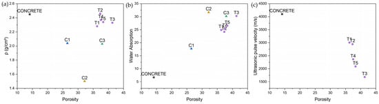 Porosity and (a) specific mass; (b) water absorption; (c) ultrasonic pulse velocity.