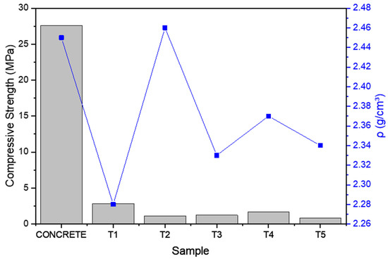 Figure 10a shows that the specific densities of the biological samples ranged from 1.5 g/cm3 (C2) to 2.46 g/cm3 (T2). In comparison, the concrete exhibited a specific density of 2.45 g/cm3, a value consistent with dense matrices composed of Portland cement and silica fume [76,77]. Porosity varied widely among the biological samples, from 26.51% (C1) to 41.32% (T3), contrasting with the lower value observed for concrete (14.11%), indicative of a compact and homogeneous structure.