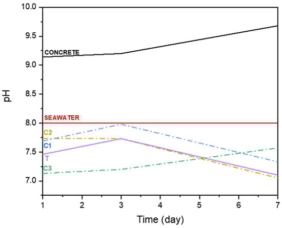 The main drawbacks associated with the use of concrete as artificial reefs are the significant environmental impact of its production, as Portland cement manufacturing is a major contributor to global CO2 emissions [19], and the inherently high surface pH of the material, which hinders initial biological colonization. This elevated alkalinity requires several months of submersion before it approaches the pH of seawater, which, during this period, limits the colonization of a wide range of marine species due to both the high pH and the leaching of calcium ions [20,21].