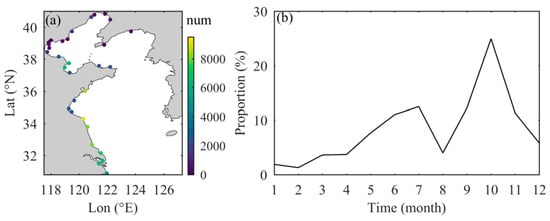 The model domain covers the BYS, East China Sea, and western Pacific. The mesh contained 23,006 nodes and 43,751 cells. The horizontal resolution of the mesh was approximately 1–2.5 km inside the Changjiang River estuary; about 2–5 km near the Subei coast; and around 9–20 km at the open boundary. Initial temperature and salinity data were sourced from the Copernicus Marine Environment Monitoring Service (CMEMS), which provides ocean monitoring indicators and reanalysis data at high horizontal resolution. The boundary conditions incorporated tidal forcing and circulation. Eight tidal constituents (M2, S2, O1, Q1, K1, P1, K2, and N2) were derived from the NAO.99b dataset, which has been utilized in previous studies to verify the accuracy of global ocean tidal models. Sea surface height (SSH), flow, temperature, and salinity were also based on CMEMS data, while surface meteorological conditions were obtained from the ERA5 dataset. Model grids, configurations, and parameters can be found in Zhong et al. [23,24]. The model was started on 1 January 2011, and the model results from 1 January 2021 to 1 January 2022 were used to drive the FMML transport model. Initial litter discharge location and total amount were informed by the 2021 coastal marine macro-litter monitoring data [25]. Monthly amounts of litter were allocated according to river runoff (Figure 2) [25]. Initially, most plastic materials float on water due to their low density; however, as biofouling occurs and microbial activity increases, the density of the plastics can rise, leading to them sinking [26]. Considering the seasonal variation characteristics of the biofouling process in the BYS, field observations of FMML distribution, and previous research findings, the model’s settling module initiated settling after 3 months, with the settling velocity set at 0.00001 m/s [27,28,29,30].
