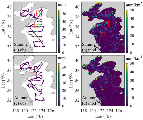 The FMML transport model’s results were compared with field observations in summer and autumn. Observation results indicate that the central North Yellow Sea and the region extending from the central South Yellow Sea to the offshore area of Jiangsu Province in summer and the northern Shandong Peninsula coastal waters in autumn are high-density areas of FMML (Figure 3a,c). The model accurately reproduces the distribution patterns of FMML high-density areas (Figure 3b,d). The FMML density in summer was higher than that in autumn based on observation and model. Additionally, model results show that the coastal waters in the Bohai Sea and the southern Shandong Peninsula, which are not covered by the observation stations, are also high-density areas of FMML.