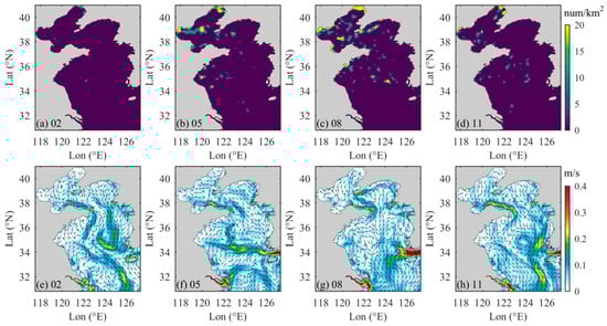 Similarly, the monthly mean current field simulated in the BYS also displays distinct seasonal variations (Figure 4e–h). Driven by the northwest winter monsoon, the powerful Lubei Coastal Current flows eastward along the Shandong Peninsula’s northern coast and subsequently extends southward, entering the South Yellow Sea. The direction of this current aligns well with the diffusion direction of FMML hotspots (Figure 4e and Figure 5f). During summer, the northward Korea Coastal Current and the westward Liaonan Coastal Current correspond well to the hotspots formed in the eastern and northern parts of the North Yellow Sea (Figure 4g). Additionally, the Lubei Coastal Current along the northern coast of the Shandong Peninsula persists stably across all seasons (Figure 4e–h), suggesting that this coastal current may serve as an important pathway for the transport of FMML from the Bohai Sea to the Yellow Sea, leading to the formation of FMML hotspots in the central South Yellow Sea.