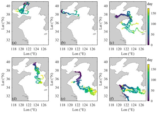 FMML transport pathways from source areas: (a) Liaodong Bay, (b) Bohai Bay, (c) Laizhou Bay, (d) northern Yellow Sea, (e) northern Shandong Peninsula coastal waters, and (f) northern Jiangsu coastal waters.