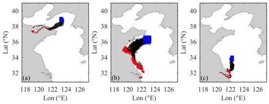 Source tracking of three typical FMML hotspots in the BYS in summer 2021 (FMML hotspots in the central of the North Yellow Sea (a), the southeastern of Chengshan Cape (b), and the offshore waters of northern Jiangsu (c); among them, the red dots represent the sources of FMML, and the blue dots represent the hotspots where FMML sinks.