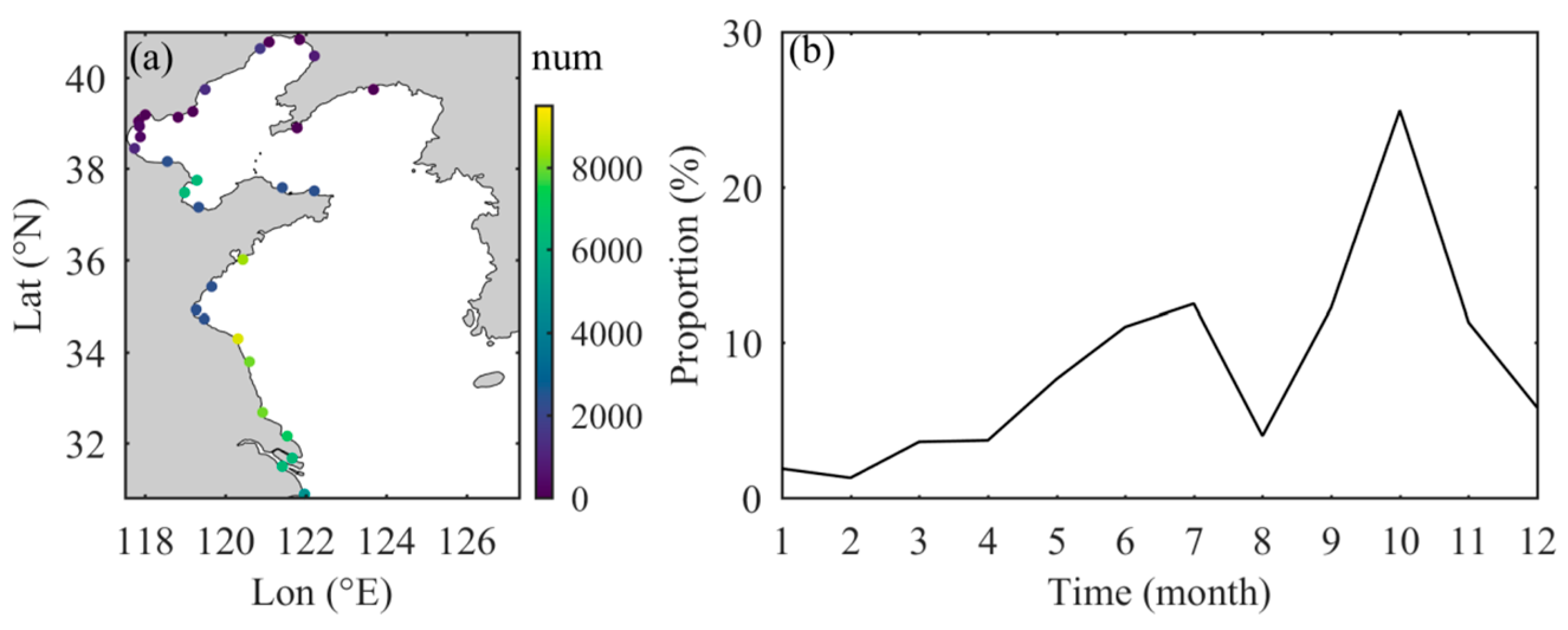 - Teng, G.; Chen, W.; Shan, X.; Shi, Y.; Jin, X. Temporal and spatial distribution of floating marine macro litter in the offshore waters of the Bohai Sea and Yellow Sea (BYS). Mar. Pollut. Bull. 2024, 209, 117232. [Google Scholar] [CrossRef]