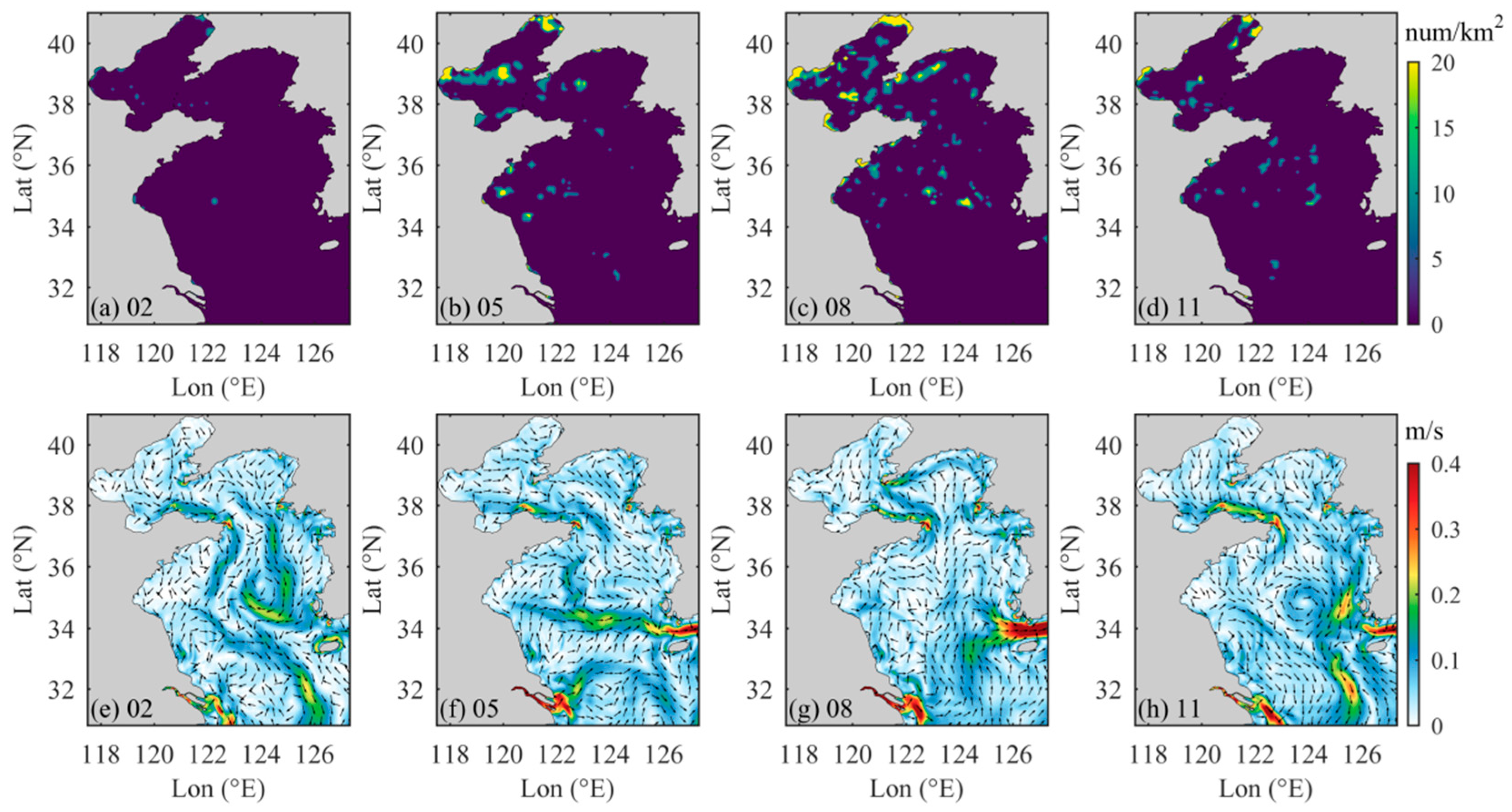 - Luo, C.; Lin, L.; Shi, J.; Liu, Z.; Cai, Z.; Guo, X.; Gao, H. Seasonal variations in the water residence time in the Bohai Sea using 3D hydrodynamic model study and the adjoint method. Ocean Dyn. 2021, 71, 157–173. [Google Scholar] [CrossRef]