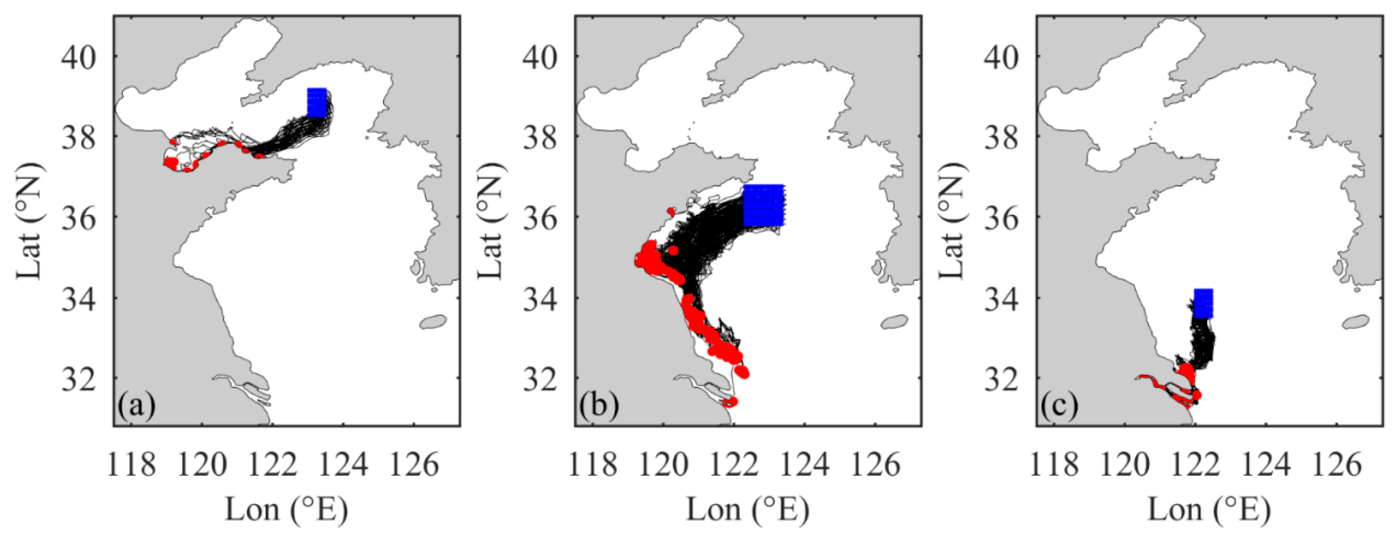 2.5. Backward Particle Tracking of FMML Hotspots in the BYS Formed During Summer
