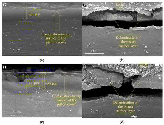 - Exhaust gas monitoring revealed that oxyhydrogen addition lowered the average combustion chamber temperature, but induced local temperature spikes, accelerating operational aging. This was manifested as intermetallic precipitation along α-A grain boundaries and formation of a dual-scale net-like structure, which acted as a brittle matrix, weakening cohesion between aluminum grains and Al–Si islands and restricting overall plastic deformation. The increased temperature and humidity in the chamber due to oxyhydrogen addition also accelerated the degradation of the piston crown surface.