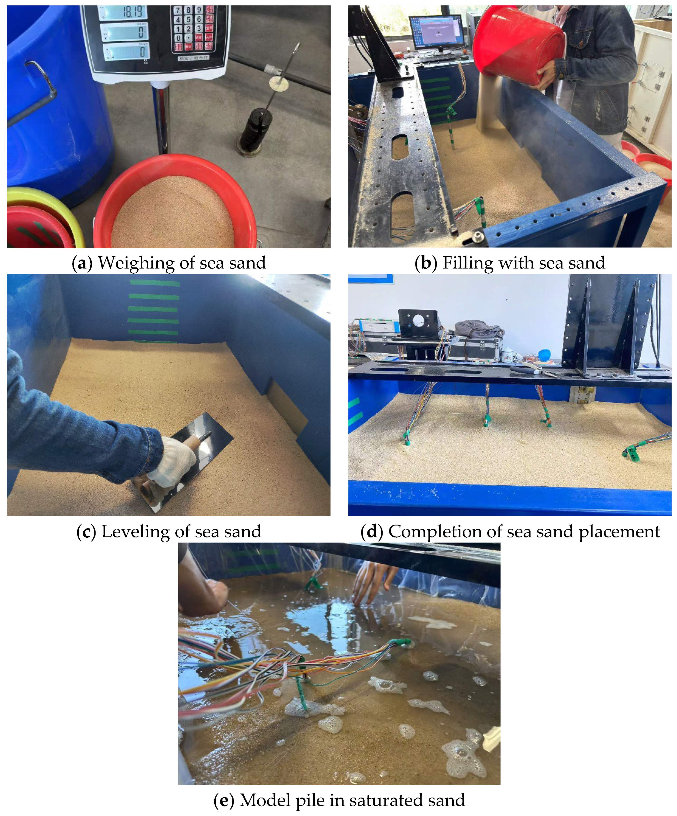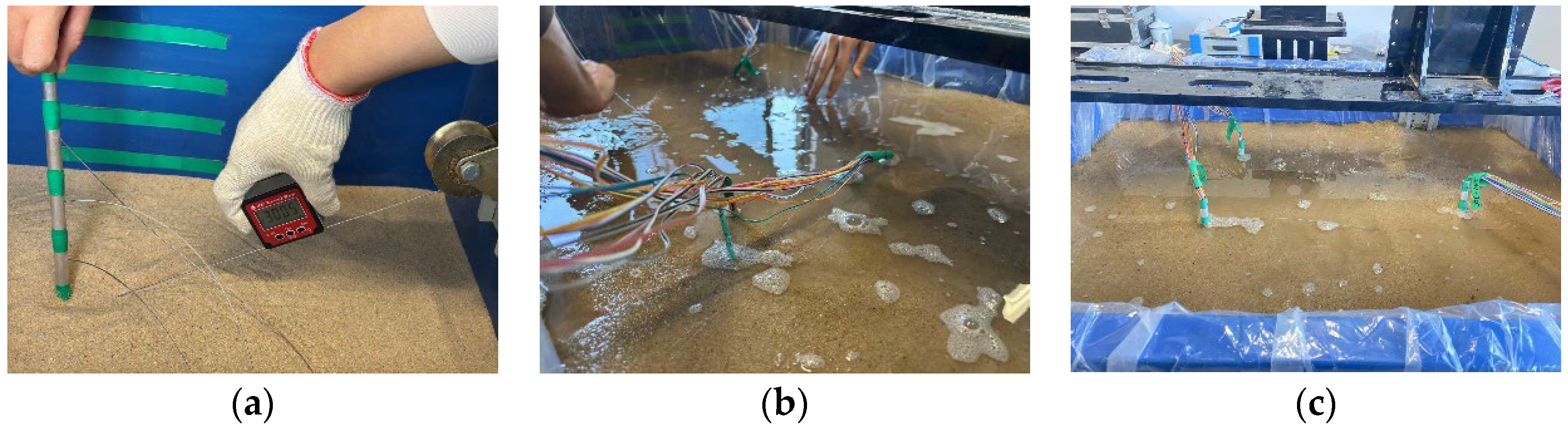 For single-pile model testing under saturated sand conditions, three piles at different loading angles were completed simultaneously in one batch. The first model pile was loaded at 30°: the steel wire rope was redirected via fixed pulleys and tensioned, with its angle measured using an electronic inclinometer. The planar position of the pile relative to the marine sand foundation soil was continuously adjusted until reaching ≈30°, thus finalizing its position. The second and third piles were loaded at 45° and 60°, respectively, requiring continuous adjustments to the positions of the model piles, reaction frame backplates, and transverse plates to achieve the target loading angles. After positioning all piles, layered placement of marine sand was performed. Following placement, the system underwent curing, after which uniform water injection was applied along the container walls via water pipe until all air bubbles were expelled from the sand and the water level exceeded the sand surface elevation. Watering was then ceased for a 24 h equilibration period. Finally, pile strain gauges were connected to the strain acquisition instrument, resistance was verified, the strain acquisition system and actuator loading system were debugged and synchronized, and loading with data collection commenced post-calibration.