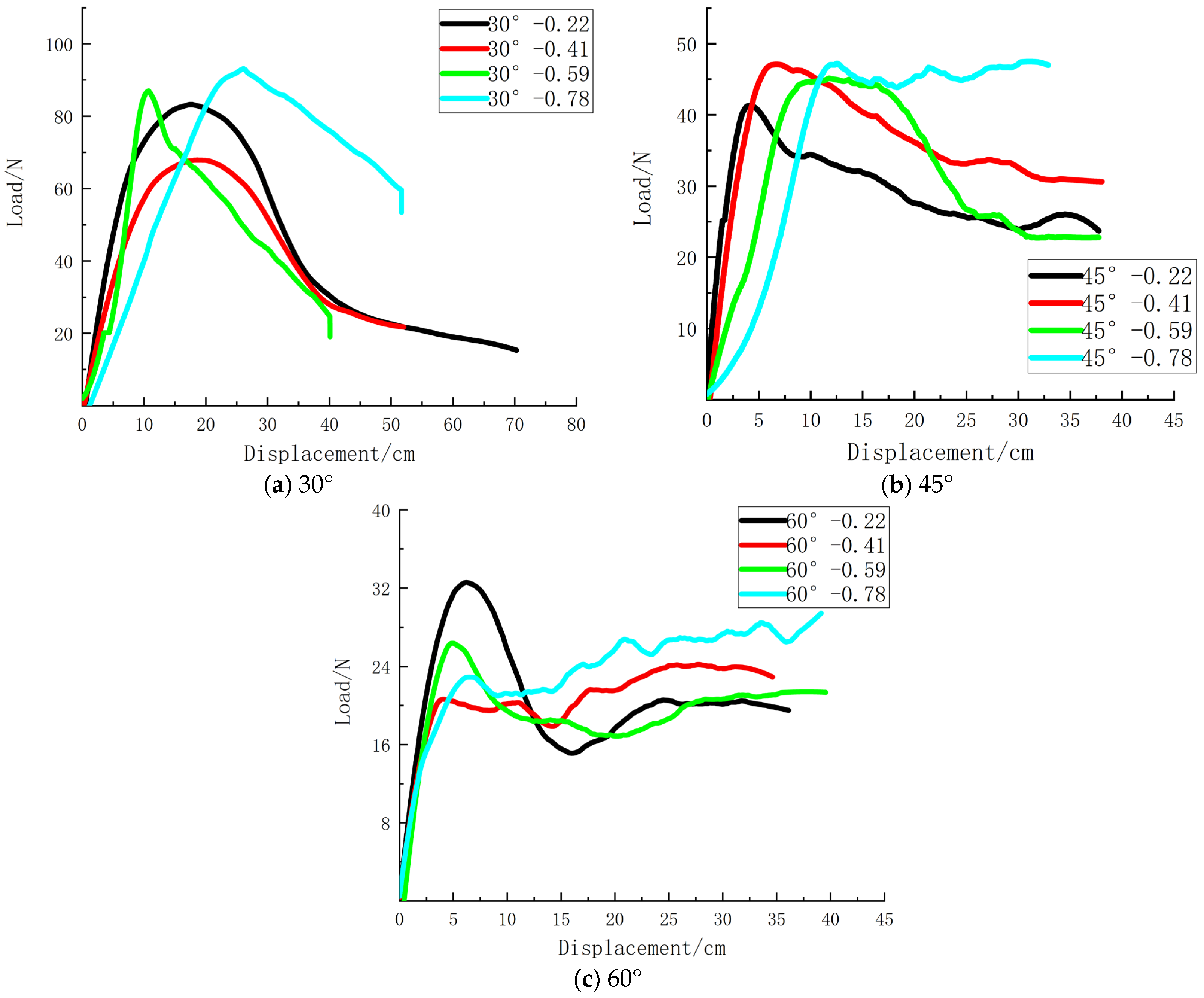 Figure 7 that when the loading angle is 30°, the ultimate bearing capacity of all model piles is relatively high. As the angle increases, the ultimate bearing capacity of the pile foundation decreases to a certain extent. This may be attributed to the fact that during the final stage of this test, the failure mode of the pile foundation was consistently pullout failure, which is controlled by vertical loads. However, the pullout failure also varies with the increase in loading depth. Specifically, the smaller the loading depth, the greater the rotation amount of the model pile and the larger the inclination angle at the top of the pile foundation. In the first half of the loading process, the ultimate bearing capacity of the pile foundation is mainly governed by horizontal loads; in the second half, it is gradually dominated by vertical loads. Therefore, the peak bearing capacity in the first half shows a significant difference due to varying angles, while the difference in residual strength in the second half is not significant. By comparing the three figures above, respectively, it can be seen that in the second half after reaching the ultimate bearing capacity, as the angle increases, the slope of the load–displacement curve also increases. This is because the model piles with a low angle encounter greater soil resistance when pulled out and destroyed, but for large angles, the soil resistance can be said to be very small.