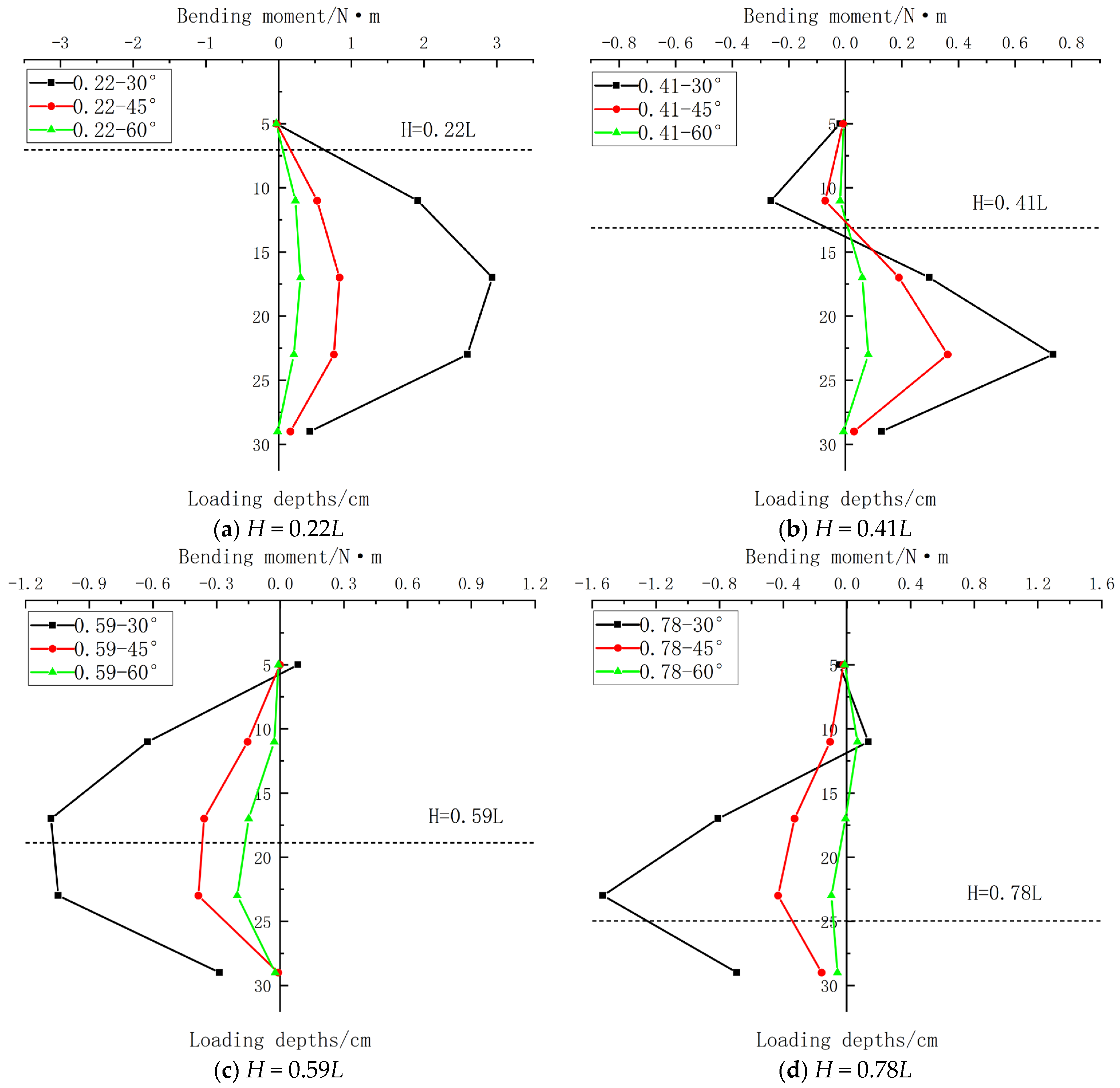 (4) At identical loading depths, bending moment distributions under different angles exhibit similar patterns but differ in magnitude. Variations primarily stem from loading depth changes: inclined loading generates horizontal forces on the upper segment (above the loading point) and lower segment (below), producing corresponding bending responses.