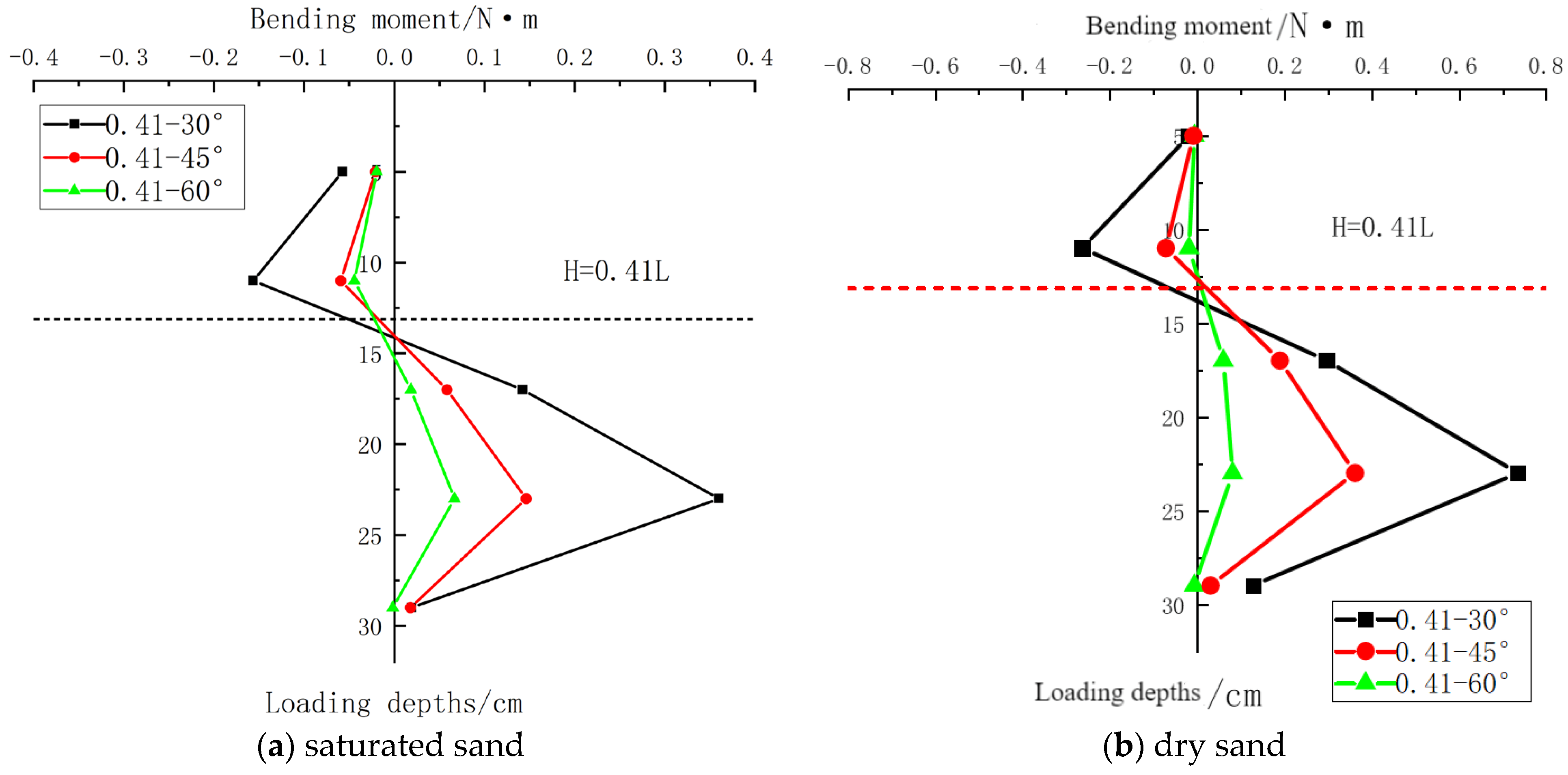 L), the bending moment distribution characteristics of the pile-anchor foundations in saturated sand under different loading angles (30°, 45°, and 60°) are entirely consistent with those in dry sand. The pile bending moment gradually decreases as the loading angle increases. This occurs because the bending moment is primarily generated by the horizontal load component acting on the pile. As the angle increases, the horizontal load component progressively diminishes.