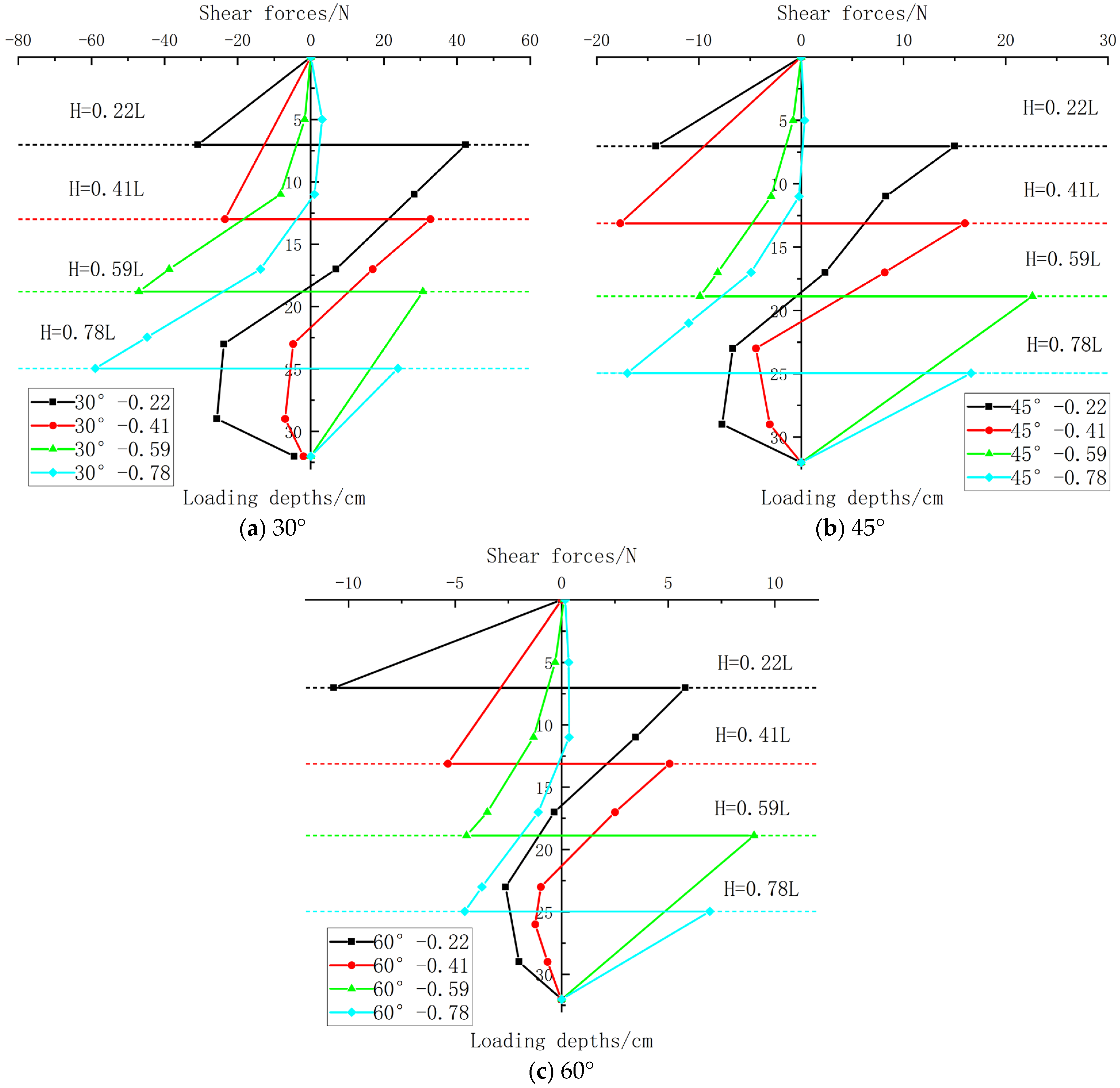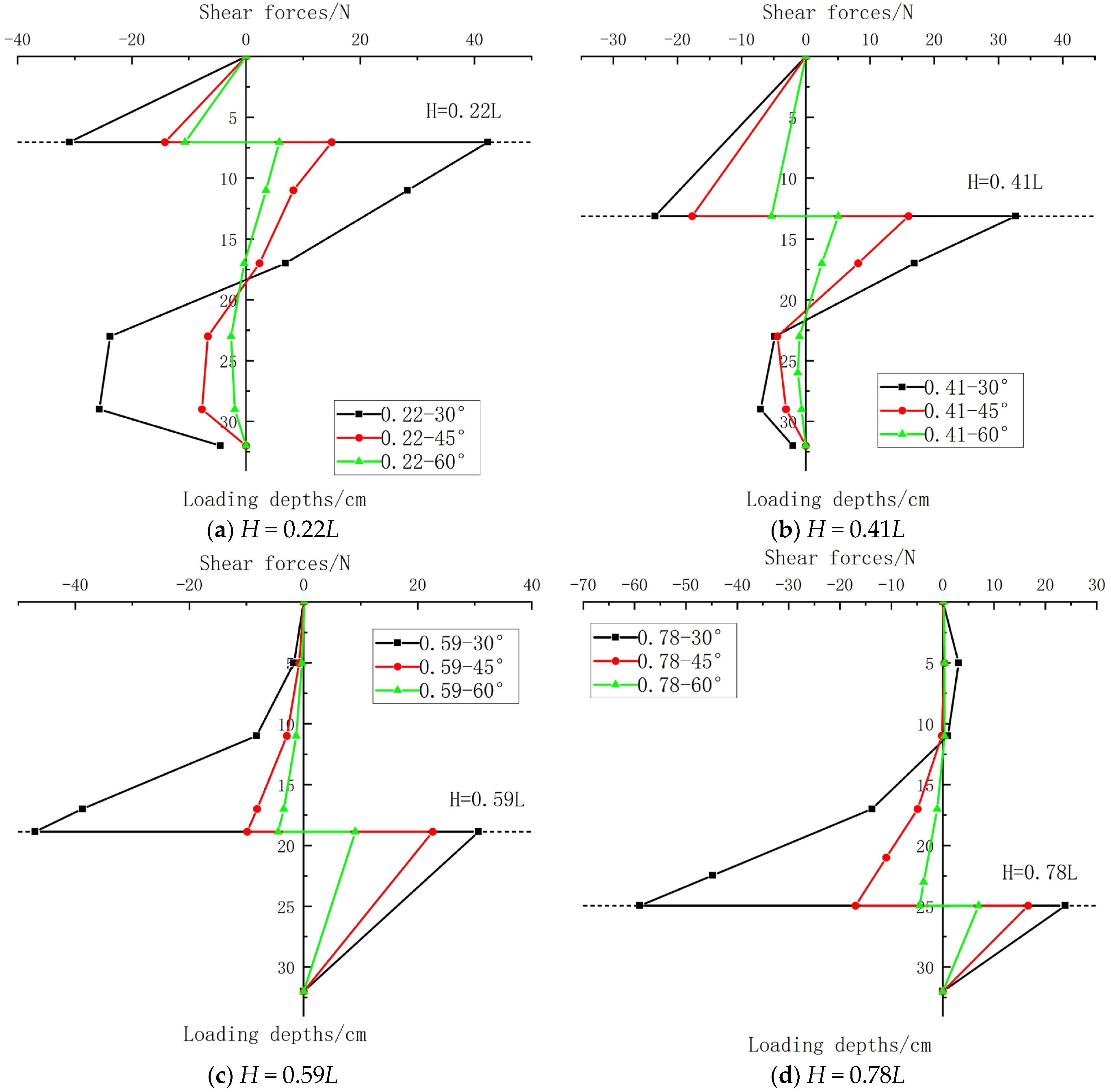 Analysis and comparison of the variation patterns of shear force with depth in the model pile under different loading depths at loading angles of 30°, 45°, and 60° are as follows: