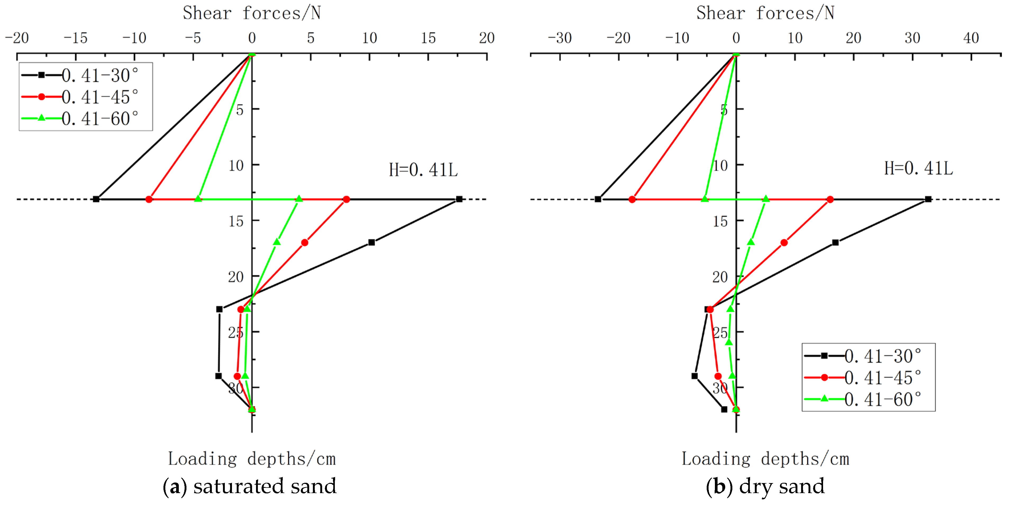 L. The loading method and data processing approach were identical to those used in dry sand. The variation in pile shear force with burial depth under saturated sand conditions is shown in